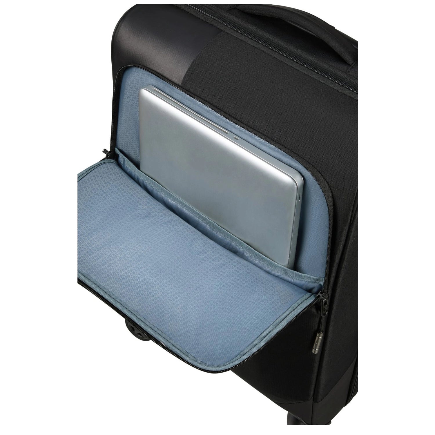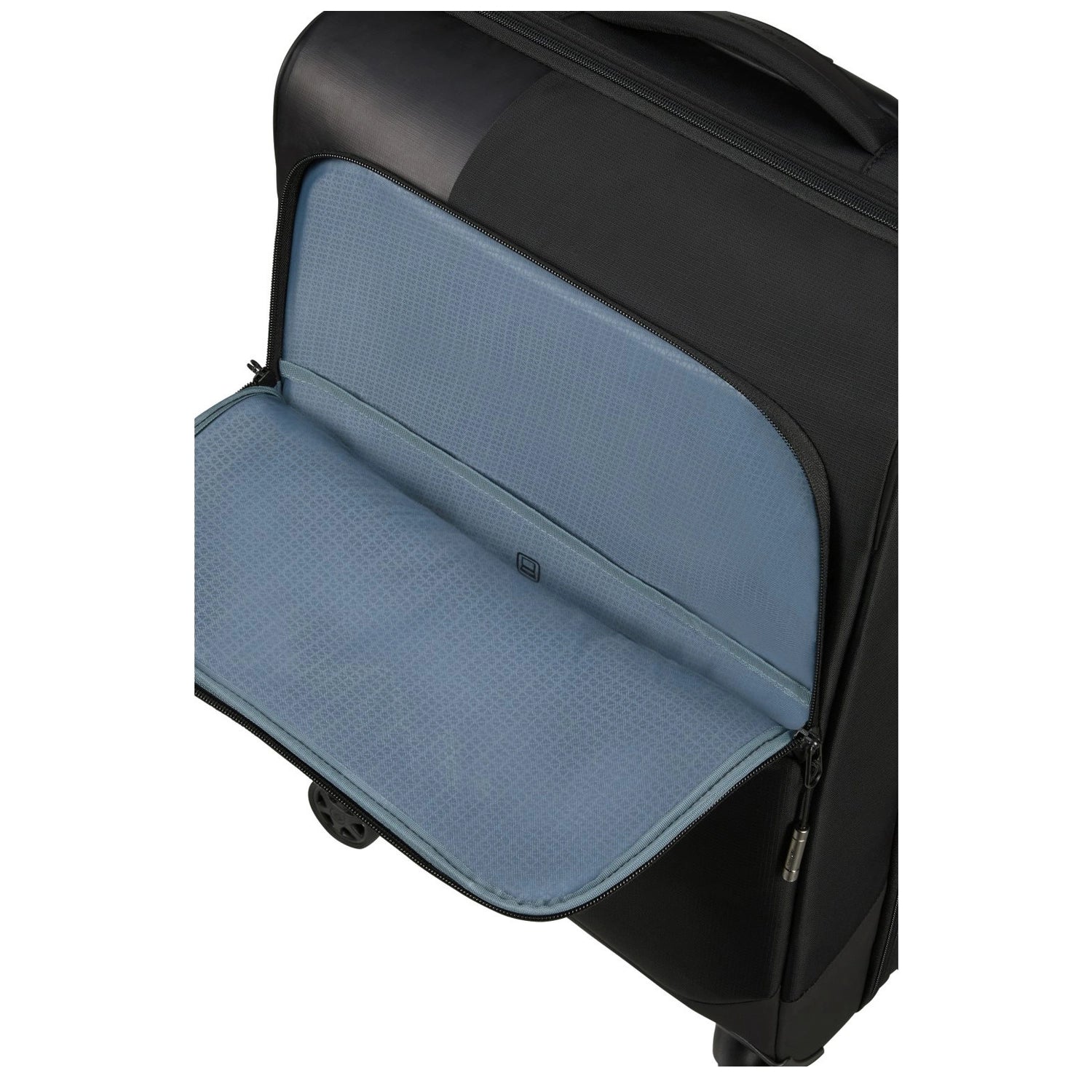 Le quattro ruote girevoli garantiscono una manovrabilità fluida in aeroporti, stazioni ferroviarie e strade strette. I dettagli neri abbinati alla tonalità Ocean Blue donano un look contemporaneo e fresco.