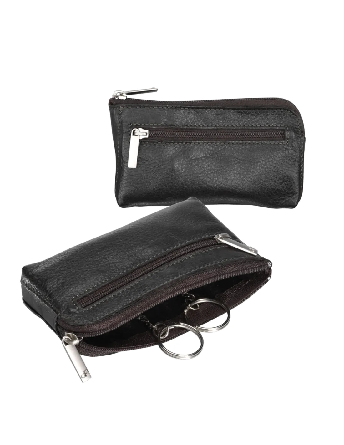 Hoofdvak met ritssluiting, voorzien van twee sleutelringen om sleutels georganiseerd te houden.